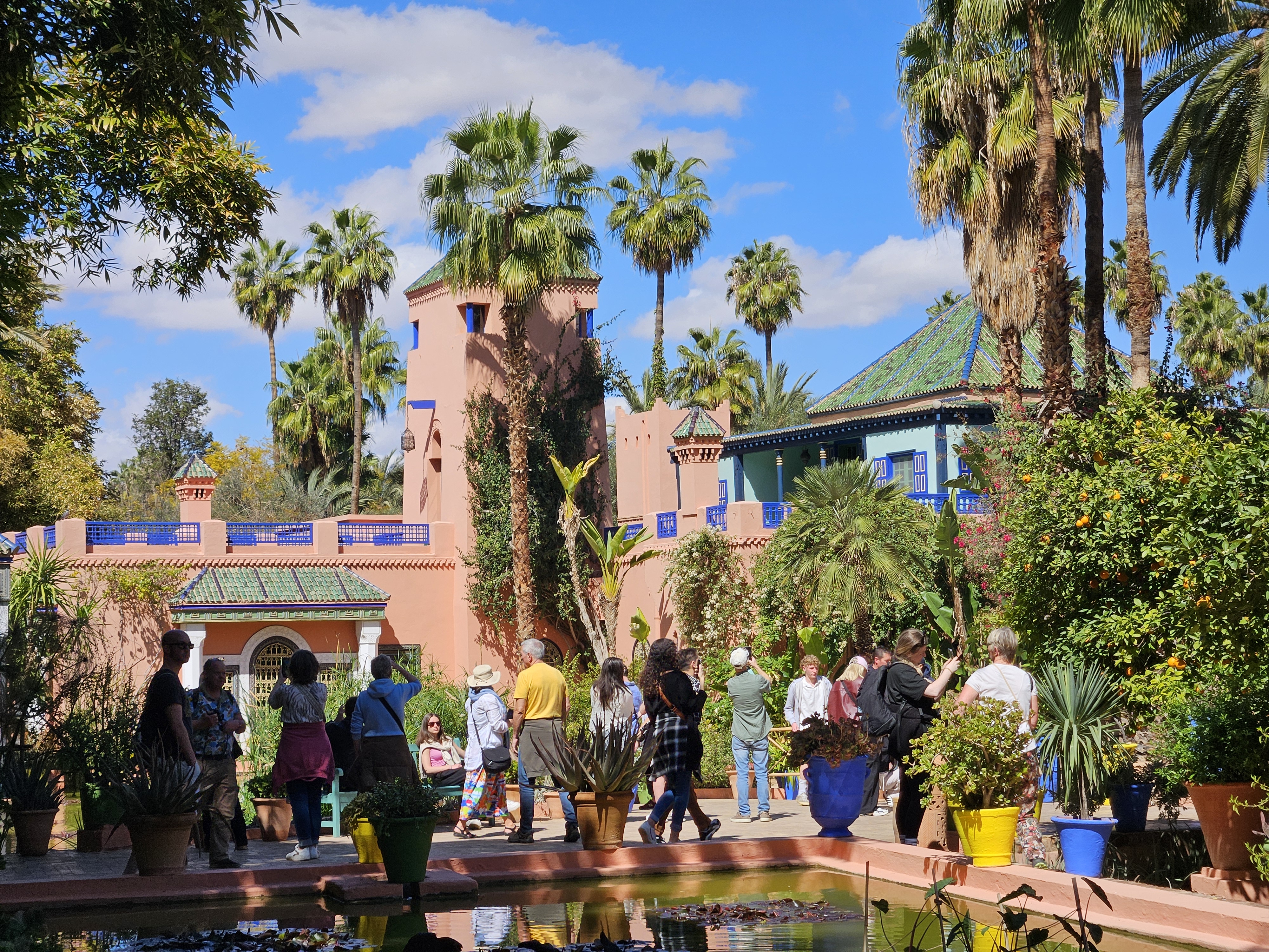 햇빛 아래 더욱 깊고 선명한 파란색이 마라케시의 붉은 벽과 대조되어, 그야말로 아름다운 색채만으로